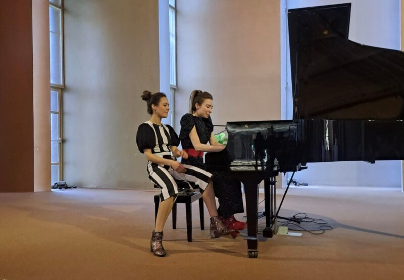 Wat een vaart, wat een originele afwisseling en wat een briljant pianospel op de wijd open gezette vleugel. Samen op één pianobankje zittend speelden de pianistes met armen en handen die moeiteloos over elkaar heen wervelden. Alle registers van de vleugel klonken fantastisch in de akoestisch zo prettige kerkzaal. Zingen kunnen de dames ook, en goed. Evenals vertellen over de te spelen en te zingen nummers: helder, geestig en in speels contact met de mensen in de zaal. Van een tango naar The man I love van Gershwin. Een vleugje Bach, knap gespeeld achter een kartonnen masker van André Rieus gelaat. Speciaal voor het duo waren stukken gecomponeerd door de Engelse componist Oliver Davis en de Turkse componist Fazil Say. Muzikaal en technisch meesterlijk uitgevoerd klonk als sluitstuk de Rhapsody in blue van George Gershwin. Door het briljante vierhandige pianospel besefte je geen moment dat niet de oerversie voor piano en orkest klonk.